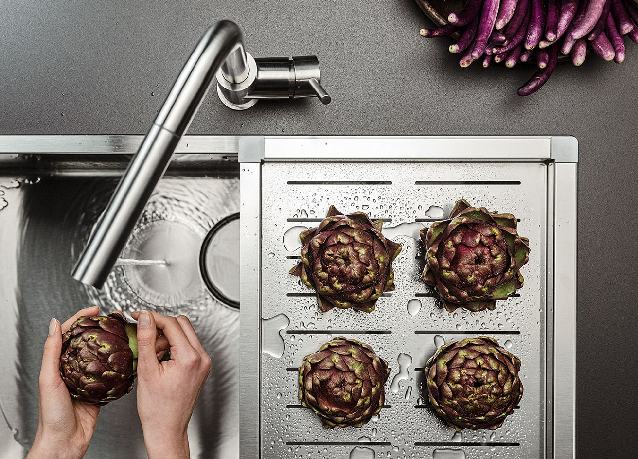 Внутренние углы с радиусом 12 мм обеспечивают легкость ухода и элегантный вид. Особая система слива Falmec делает мойку узнаваемой с первого взгляда.