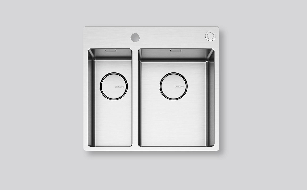 Главные особенности: инновационный встроенный сливной клапан на краю мойки и эксклюзивная система слива Falmec с крышкой.