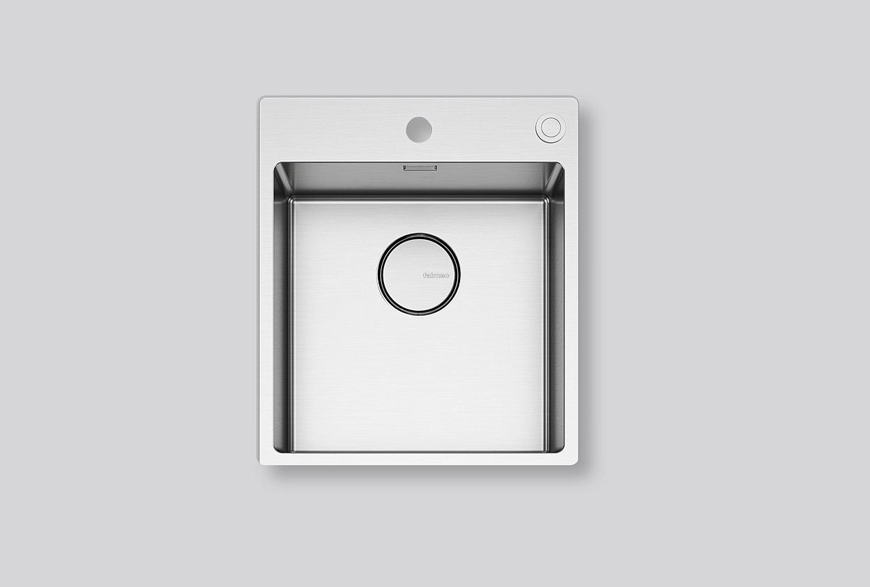 Главные особенности: инновационный встроенный сливной клапан на краю мойки и эксклюзивная система слива Falmec с крышкой.