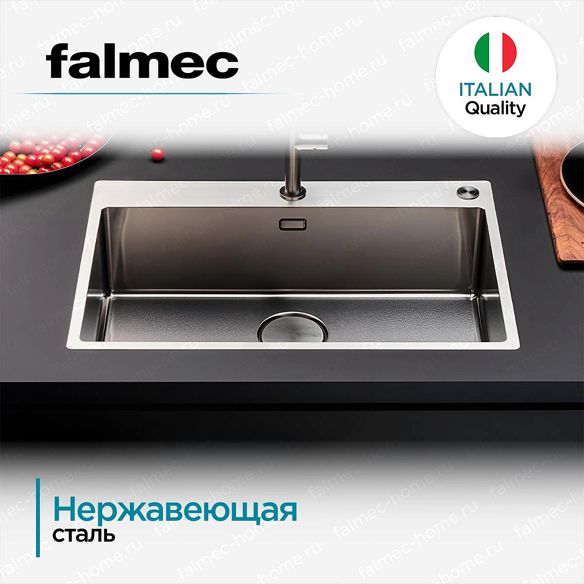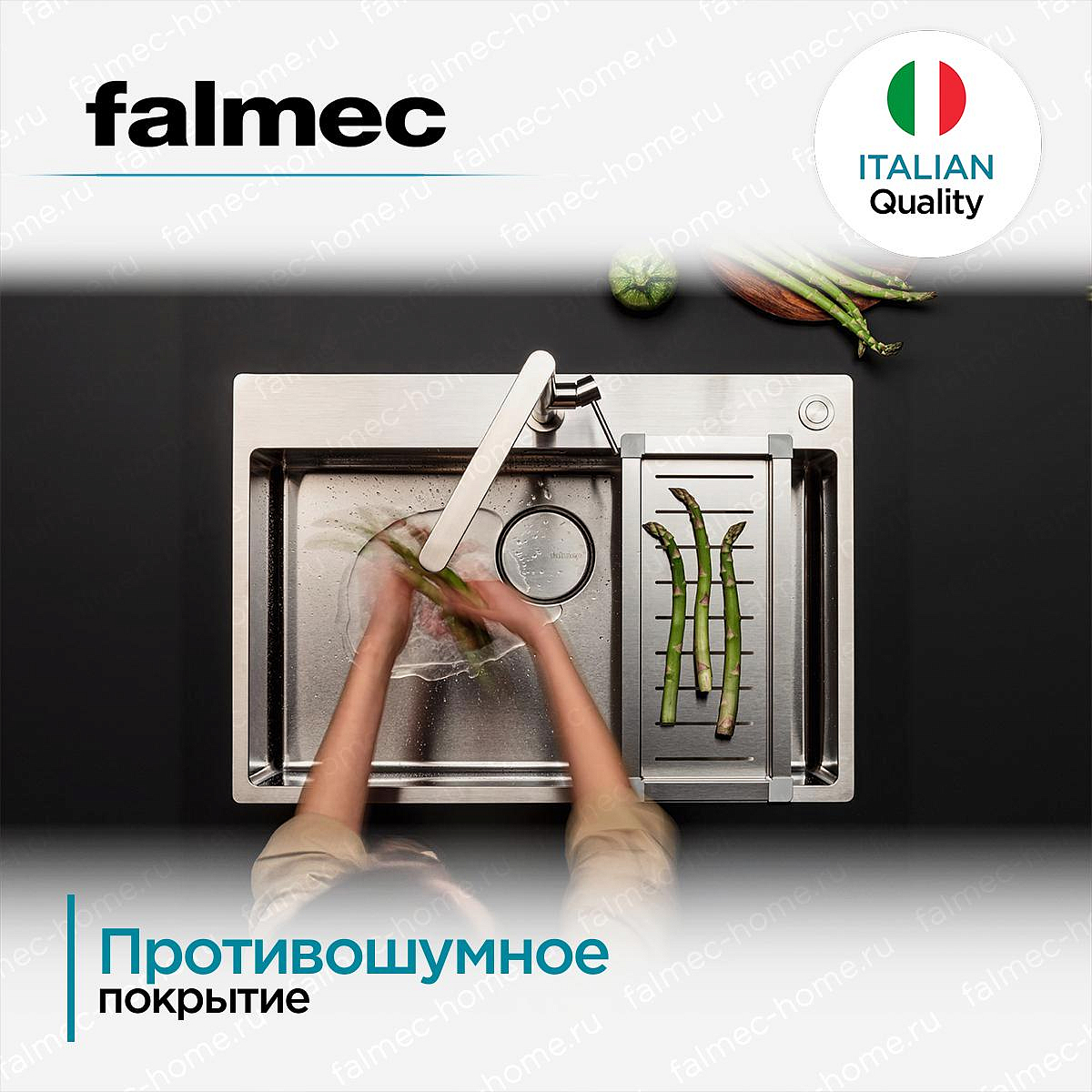 Главные особенности: инновационный встроенный сливной клапан на краю мойки и эксклюзивная система слива Falmec с крышкой.