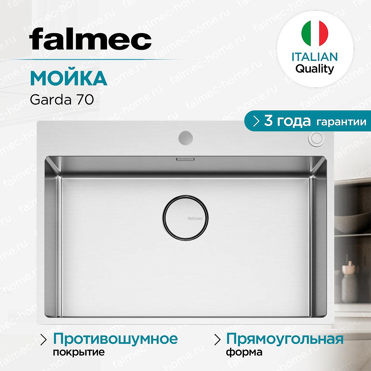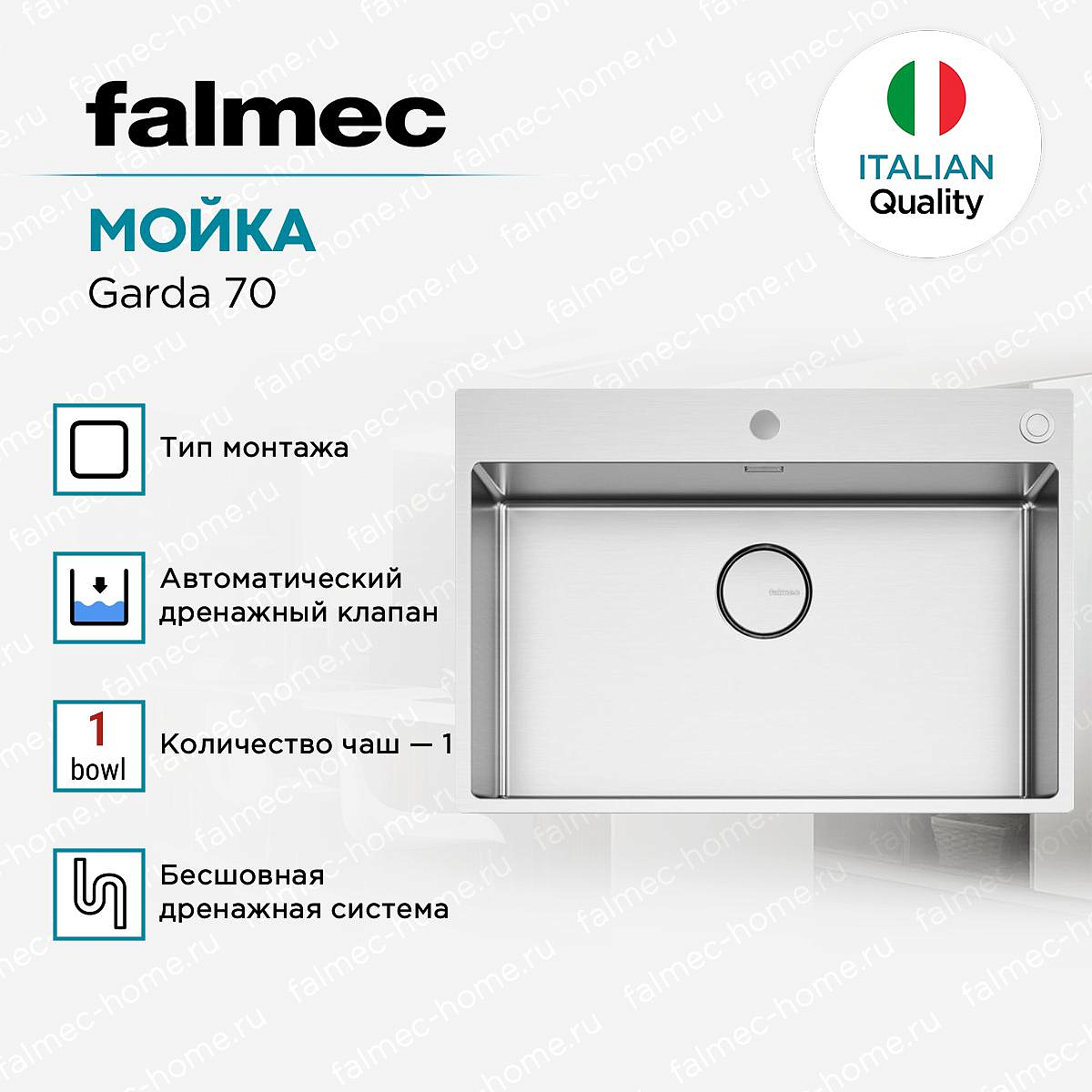 Мойка Falmec Garda 70 оснащена противошумным покрытием, которое снижает уровень шума при использовании, а также бесшовной дренажной системой, которая предотвращает утечку воды и облегчает процесс чистки. Радиус скругления чаши составляет 12 мм, что придает мойке эстетический вид и облегчает ее уход.