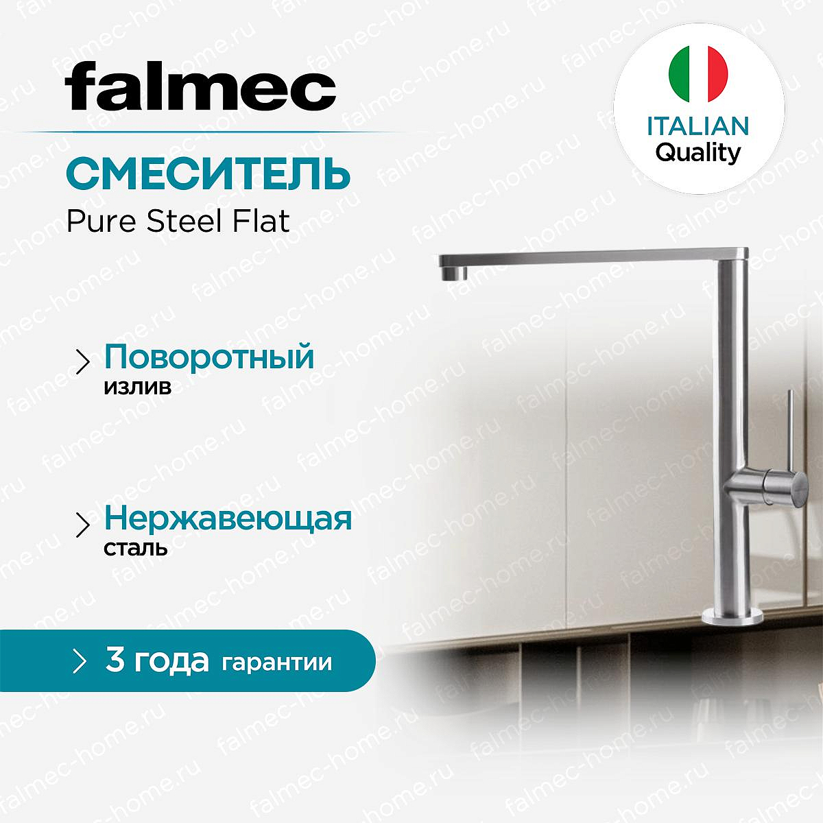 Смеситель Falmec Pure Steel Flat предлагается с гарантией на 60 месяцев, что подтверждает его высокое качество и надежность. Это подтверждает стремление производителя к обеспечению долговечности и надежности своих продуктов. Страна-производитель, Италия, известна своим высоким качеством производства и строгим контролем качества, что гарантирует долгий срок службы этого смесителя.