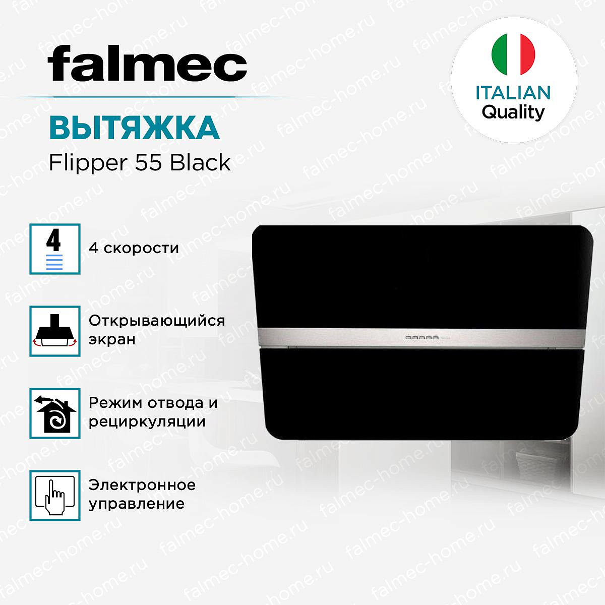 Вытяжка Falmec DESIGN FLIPPER 55 BLACK (800) обладает индивидуальным эргономичным дизайном, компактными размерами и отлично подходит для рационального распределения полезной площади в помещении с ограниченным пространством. Надёжно фиксируемая в открытом и закрытом положении крышка экономит место, защищает рабочую поверхность и улучшает фокусировку воздушного потока.