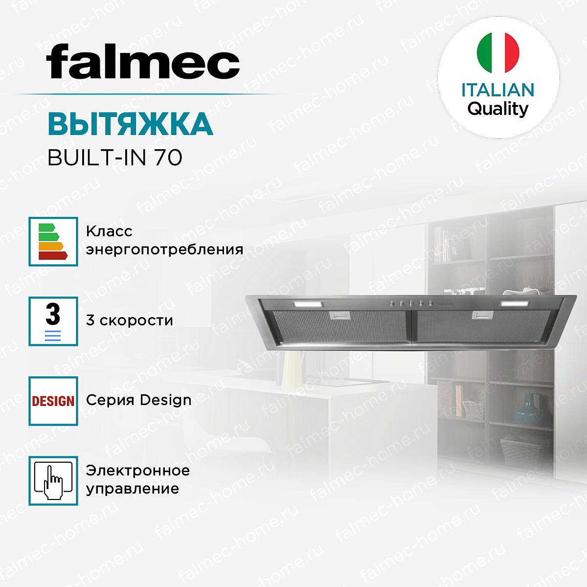 Вытяжка Фалмек BUILT-IN 70 оснащена кассетным металлическим фильтром BASE, надежно задерживающем частицы жира и копоти и не позволяющим из оседать на деталях прибора. Для эффективной работы фильтры рекомендуется очищать не реже раза в месяц. Для этого необходимо примерно на час замочить их в очень горячей воде с добавлением средства для мытья посуды. Кассетный фильтр может быть дополнен угольным, обеспечивающим работу прибора в режиме рециркуляции. Угольный фильтр в комплект не входит, приобретается дополнительно.
