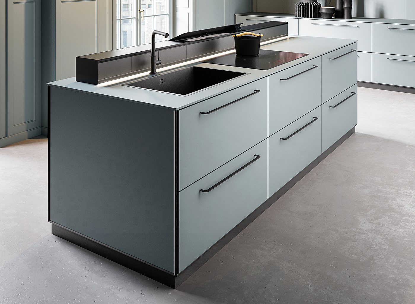 Модель встраивается прямо в столешницу, что позволяет экономить пространство на кухне, сохраняя при этом высокую эффективность работы. Сенсорное управление делает использование этой модели максимально удобным и простым. Сенсорные переключатели обеспечивают быстрый и точный отклик на любые изменения режима работы. Вытяжка Monolith может управляться напрямую с варочных панелей Falmec, благодаря сенсорному блоку управления, расположенного на поверхности индукции.